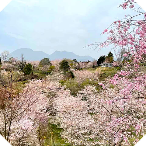 くじゅう連山の麓にある自然豊かなロケーションにしだれ桜の里はあります。山の傾斜を活かした約10万平方メートルの広大な敷地一面に6種類(大漁桜・コマツオトメ・八重紅しだれ・ヨウコウザクラ・オモイカワザクラ・八重桜)・約2600本の桜が咲き乱れ、西日本随一の規模を誇ります。