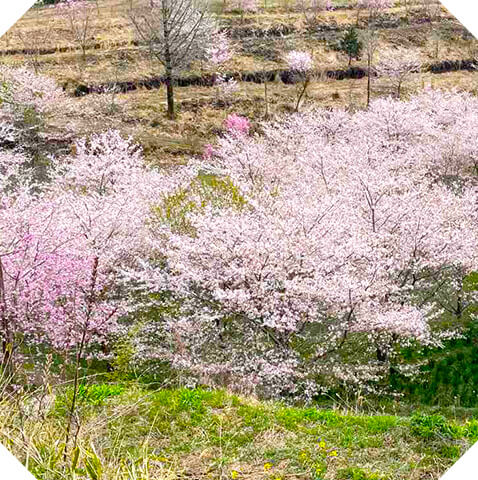 「しだれ桜の里」は、2600本 6種類の桜が咲き誇る自然公園。しだれ桜300本は西日本一の規模を誇り、ほかにも3月初旬に開花予定の早咲きの大漁桜1600本、陽光桜、八重桜など、さまざまな品種が楽しめます。濃淡さまざまな桜色のグラデーションが里山を彩る景色は圧巻です。